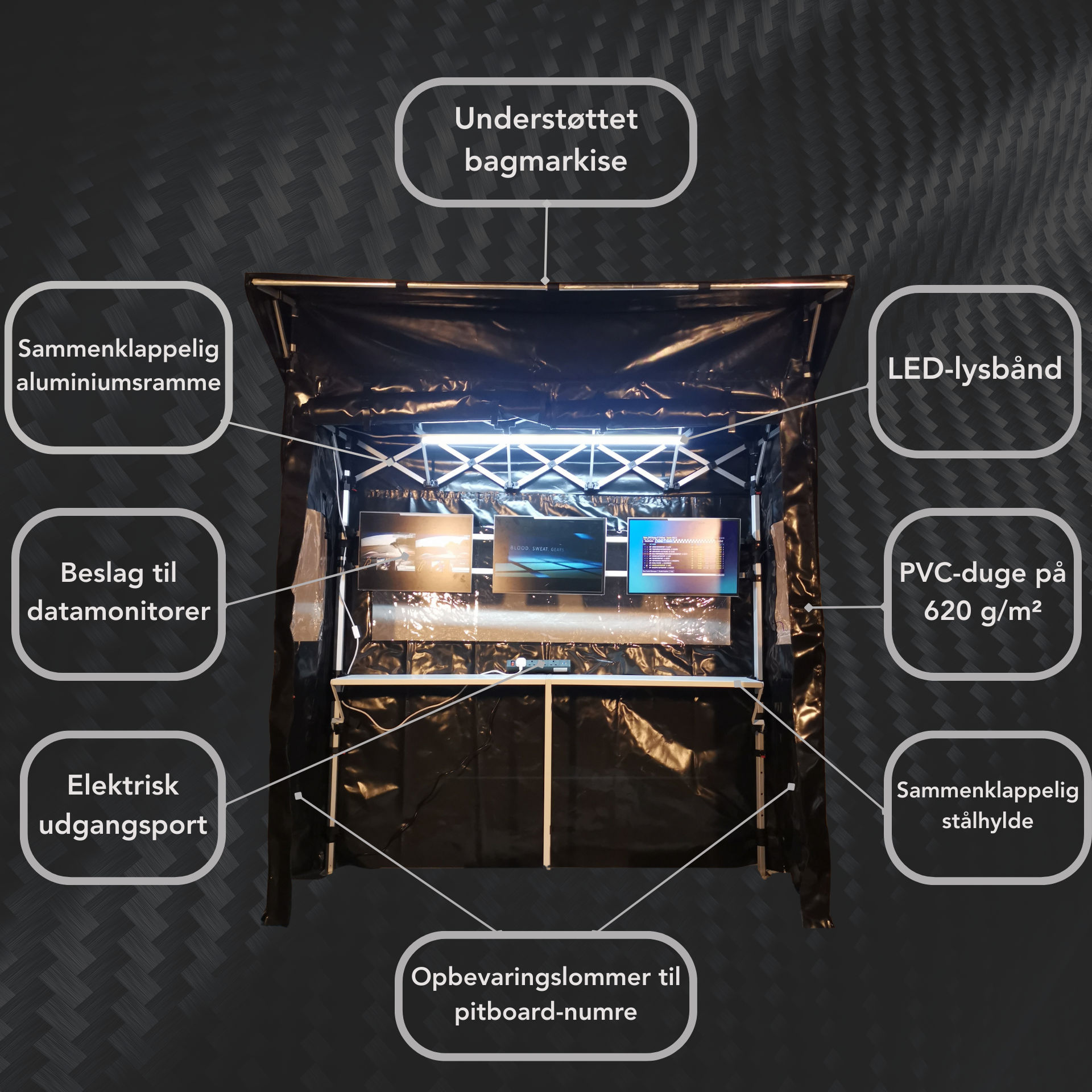 Integrerede beslag til datamonitorer er placeret, så live timing-, telemetri- og strategiskærme understøttes i ergonomisk arbejdshøjde. En intern LED-lysbånd sikrer ensartet belysning under sessioner med lavt lysniveau og under lange løb. Pit Perch er lukket med kraftige PVC-duge på 620 g/m², udviklet til at beskytte både personale og udstyr gennem hele raceweekender.