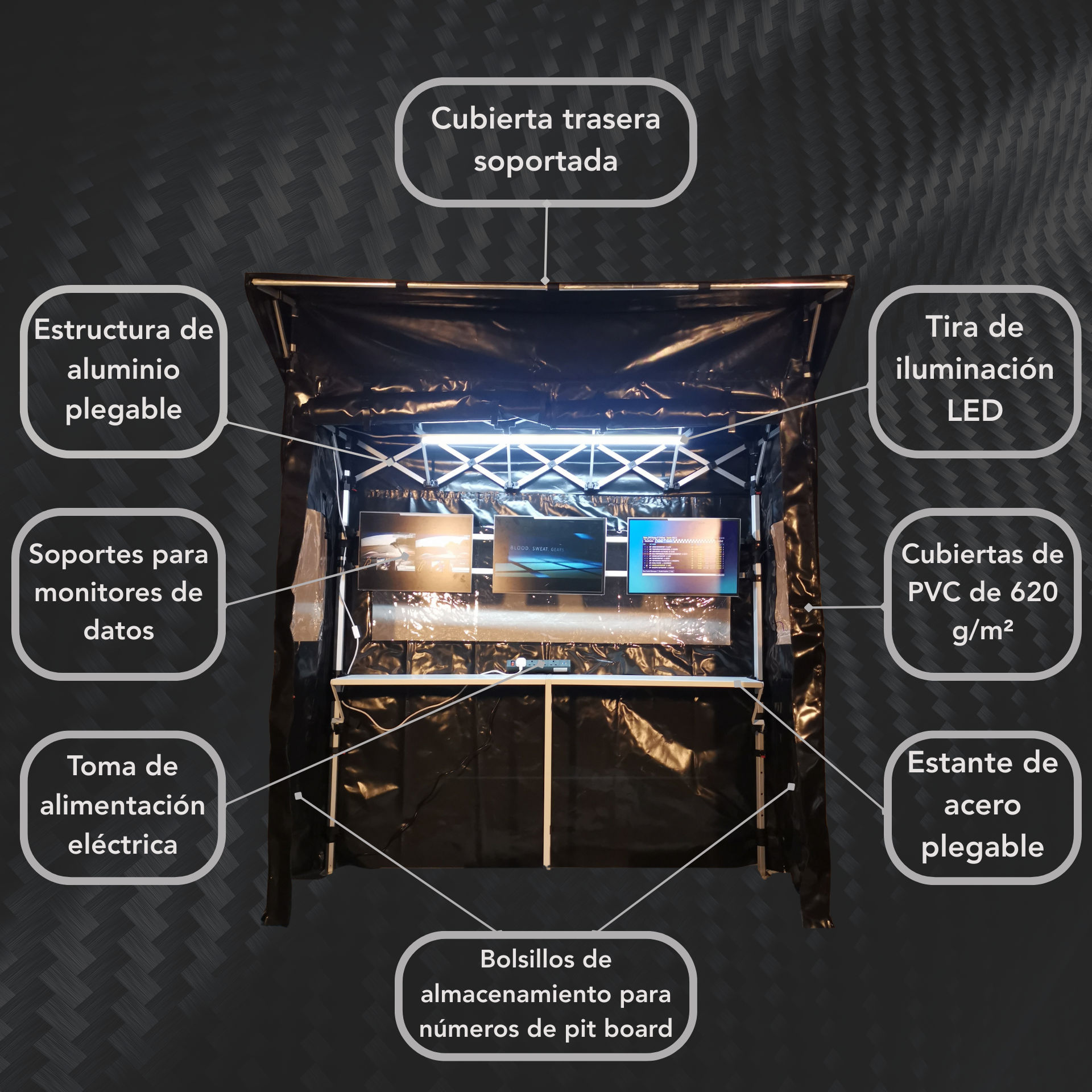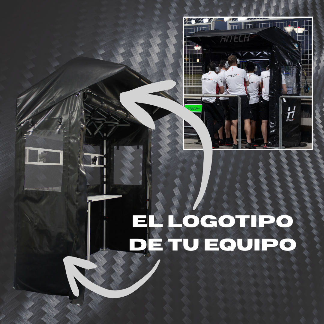 La estructura se basa en un chasis de aluminio plegable que permite un montaje rápido manteniendo una excelente estabilidad una vez instalada. La cubierta trasera soportada ofrece protección superior sin aumentar la huella en la pit lane, permitiendo a los equipos trabajar en condiciones meteorológicas cambiantes sin comprometer la visibilidad ni el movimiento.