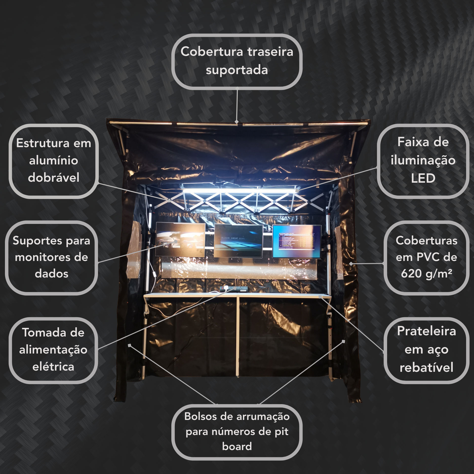 A estrutura assenta num chassis em alumínio dobrável, permitindo uma instalação rápida enquanto garante uma excelente estabilidade depois de montada. A cobertura traseira suportada oferece proteção superior sem aumentar o espaço ocupado na pit lane, permitindo que as equipas trabalhem em condições meteorológicas variáveis sem comprometer a visibilidade ou a mobilidade.